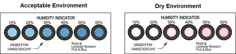 La etiqueta indicadora de la humedad relativa (Humidity Indicator Cards – HIC) lleva seis puntos con diferentes porcentajes del cloruro de cobalto. El cloruro de cobalto es muy higroscópico en reacción a la humedad; cambia su color desde el azul violeta al violeta hasta el color violeta-anaranjada. Gracias al dicho efecto, podemos detectar fácilmente la humedad relativa (mediante estos puntos) en cualquier lugar en el que la tarjeta está presente.